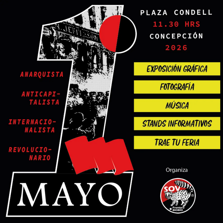 Actividades/abril 7, 2026/242 views Concepción: 1ro de mayo anarquista, anticapitalista, internacionalista, revolucionario Les esperamos para compartir una nueva jornada de lucha económica! Desde las 11.30 a las14 hrs en el odeón de la Plaza Condell. #1mayo #anarquismo #concepcion #trabajadores Tags:actividadesRelated Posts457 viewsActividades/abril 16, 2026 /No Comment Santiago: 8vo Encuentro del Libro y la Propaganda Anarquista – octubre 2026424 viewsActividades/abril 10, 2026 /No Comment Santiago: Círculos de Lectura «Emisarixs de la Nada» – 25 marzo al 7 mayo Leave a Response Cancelar la respuestaCommentName Email Guarda mi nombre, correo electrónico y web en este navegador para la próxima vez que comente.