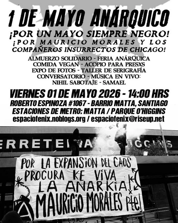 Ante la conmemoración que se avecina, dejamos la invitación abierta para conocer más sobre esta fecha, propia de la anarquía. En la instancia, recordaremos episodios insurreccionales en EE.UU., los orígenes del primero de mayo ligados estrechamente con la violencia revolucionaria, para posteriormente, acercarnos a nuestro territorio, repasando hechos de violencia política, más allá de golpes reprevisos, recordando al compañero Mauricio Morales, además del lúcido rechazo al sindicalismo y al trabajo asalariado (que alguna vez la anarquía abrazó), hoy, solo un lastre que debe acabar.