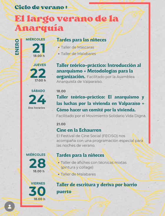 Estaremos colaborando con nuestra vecina @bibliojorgefarias en las actividades en la plaza echaurren y en instancias autoformativas y de conversa en nuestro espacio con la @asambleaanarquistavalparaiso