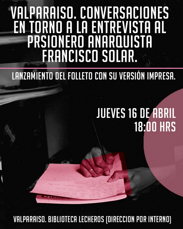 Valparaiso. Conversaciones en torno a la entrevista al prisionero anarquista Francisco Solar. Lanzamiento del folleto con su versión impresa.